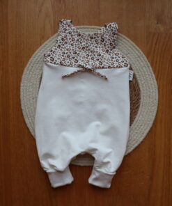 Der Babystrampler hat extralange Mitwachsbündchen, die toll mitwachsen und dafür sorgen, dass der Strampler lange getragen werden kann. Er ist am Po weit geschnitten und bietet auch bei einer Stoffwindel gut Platz. Oben ist er mit zwei Druckknöpfen geschlossen und mit einer Kordel verziert.