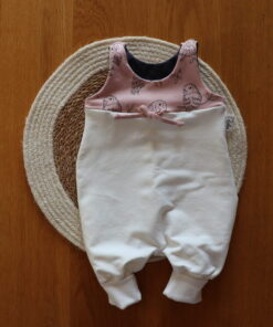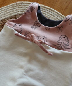 Der AYLUN Baby Strampler | Rosa Eule hat extralange Mitwachsbündchen, die toll mitwachsen und dafür sorgen, dass der Strampler lange getragen werden kann. Er ist am Po weit geschnitten und bietet auch bei einer Stoffwindel gut Platz. Oben ist er mit zwei Druckknöpfen geschlossen und mit einer Kordel verziert.