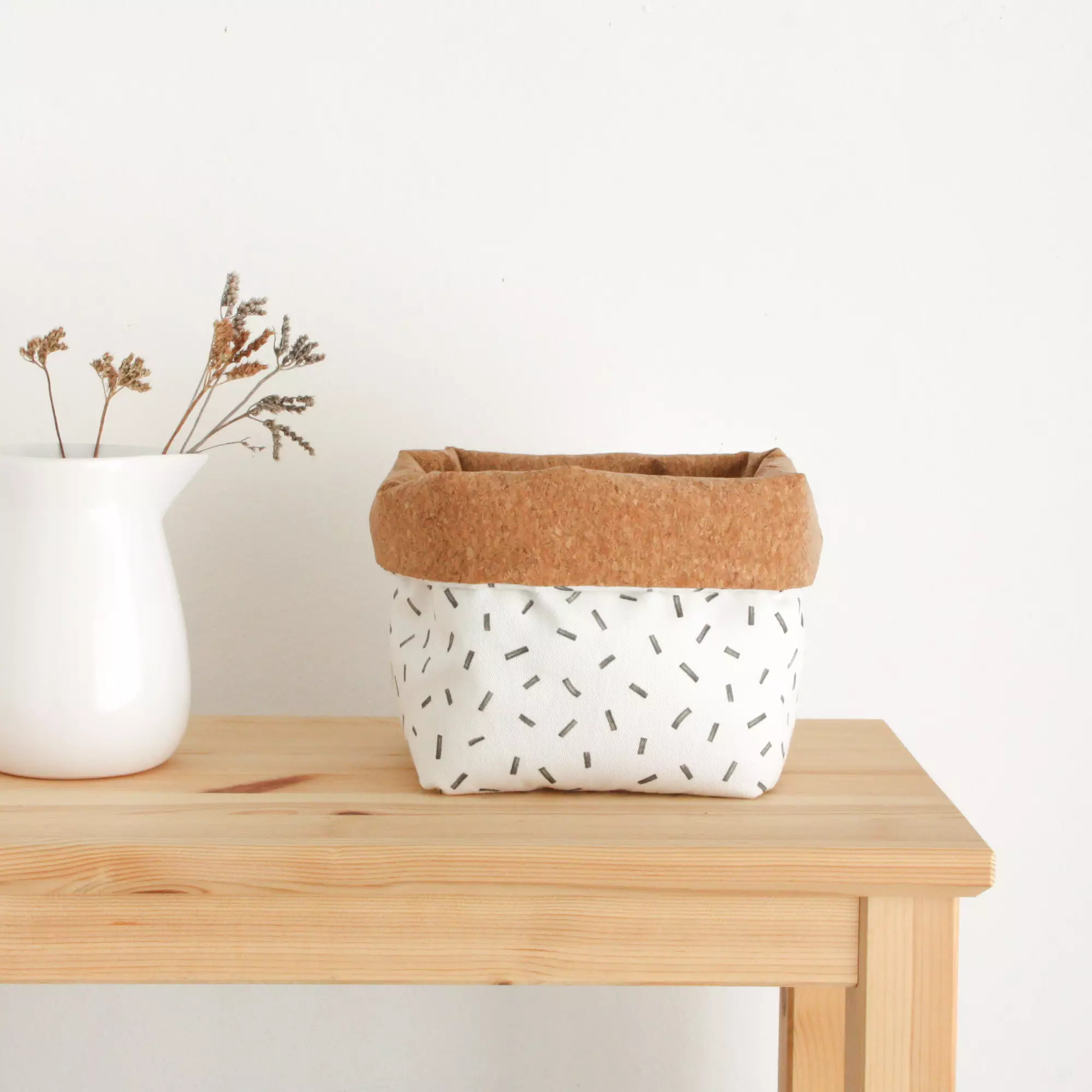Diese multifunktionale Aufbewahrungskorb besteht aus weicher Musselin-Baumwolle und nachhaltigem Kork. Sie eignet sich ideal zum Verstauen von Windeln, Cremes, Spielzeug oder anderen Utensilien im Kinderzimmer und fügt sich ebenso harmonisch in andere Wohnbereiche ein. Das schlichte und zeitlose Design macht sie zu einem langlebigen Begleiter in deinem Zuhause.