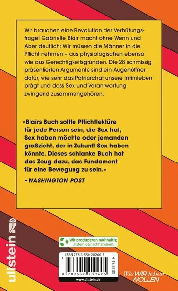 Es ist ein Debattenbuch für alle, die keine Angst vor patriarchal geprägten Tabus haben – und mit ihnen aufräumen wollen. Nur weil Frauen Kinder bekommen können, sollen sie für die Verhütung zuständig sein? Kann es sein, dass wir da ein paar Fakten ignorieren? Männer können lebenslang 24/7 Kinder zeugen, während Frauen pro Zyklus nur einen Tag fruchtbar sind. Frauen können ihren Eisprung weder steuern noch verhindern, während Männer ihren Samenausstoß durchaus lenken können – und sei es in ein Kondom. Gabrielle Blair liefert die ultimative Grundlage, die Verantwortung für Verhütung neu auszudiskutieren.