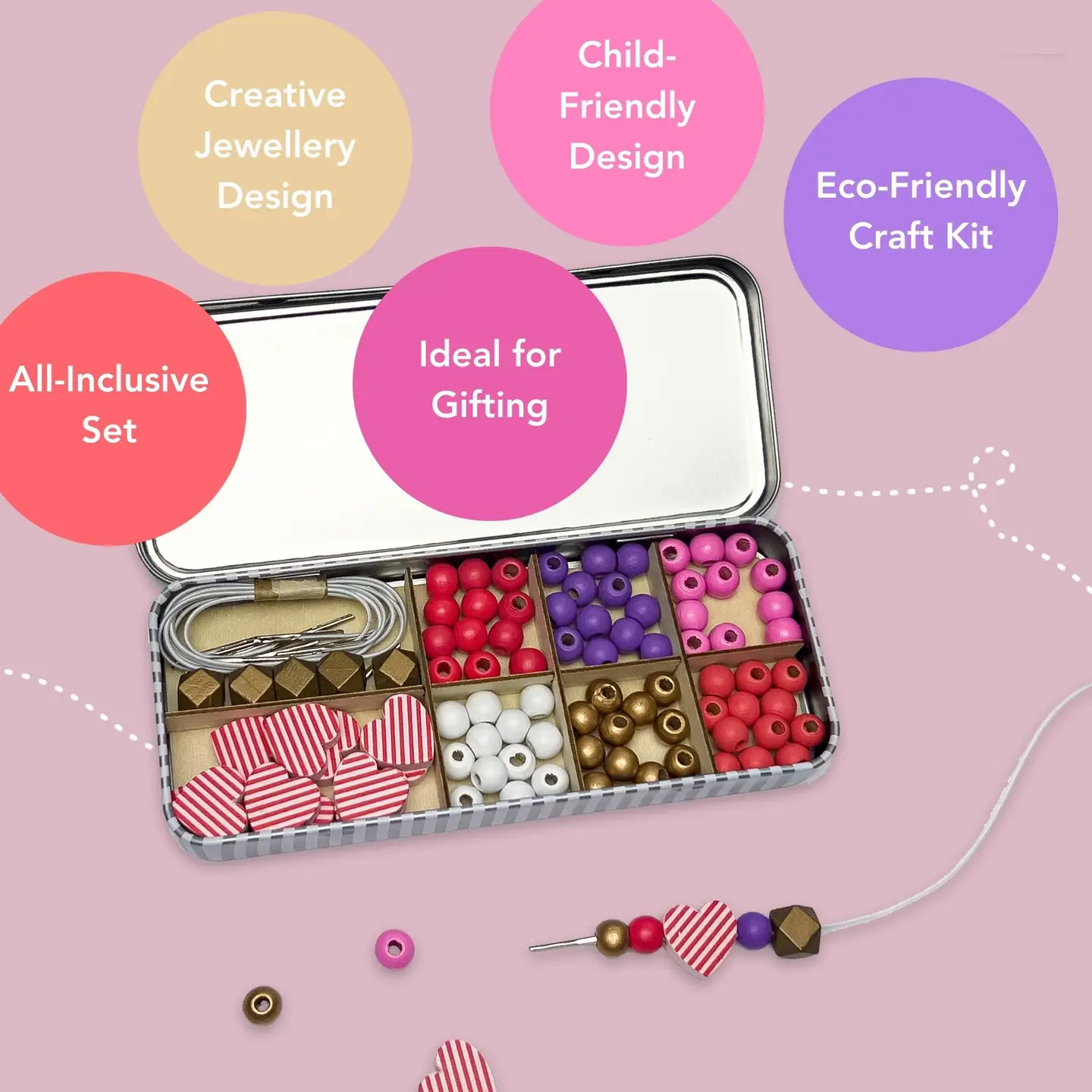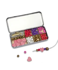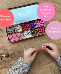 MATERIALIEN: Dose, Holzblumenperlen, 5 weiße Gummibänder mit Metallenden zum einfachen Auffädeln. UKCA/UKNI/CE-geprüft