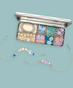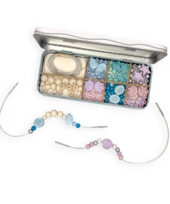 Dieses Set enthält Gummibänder mit Metallenden, um auch kleinen Kindern das Auffädeln der Perlen zu erleichtern.
