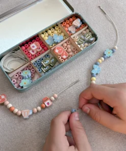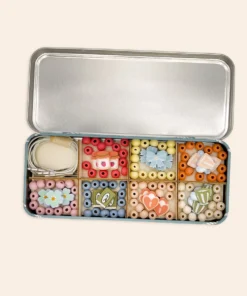 MATERIALIEN: Dose, Holzblumenperlen, 5 weiße Gummibänder mit Metallenden zum einfachen Auffädeln. UKCA/UKNI/CE-geprüft