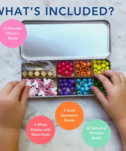 MATERIALIEN: Dose, 12 Einhorn-Holzperlen, 5 goldene geometrische Holzperlen, 60 kugelförmige Holzperlen, 5 weiße Gummibänder mit Metallenden zum einfachen Auffädeln. UKCA/UKNI/CE-geprüft