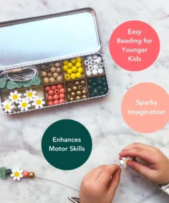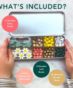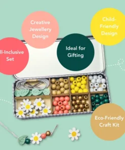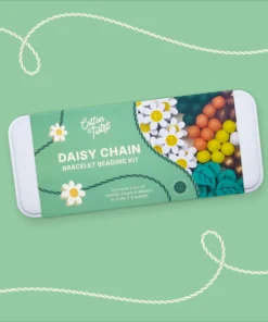 Das Cotton Twist Holzperlen Armband 5er Set Dose | Gänseblümchen ist perfekt für Drei- bis Achtjährige. Es enthält genug Perlen für die Herstellung von 5 Armbändern sowie eine Auswahl an Regenbogen-, Blumen-, goldenen geometrischen und farbenfrohen kugelförmigen Perlen. Kinder können die Armbänder zu ihren Lieblingsoutfits tragen, sie an Freunde verschenken, die sie lieben, oder sie mit Freunden auf einer Party basteln.