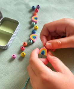 MATERIALIEN: Aufklappbare Dose, hölzerne Regenbogenperlen, kugelförmige Perlen, Gummiband mit Metallenden zur Erleichterung des Perlenstickens. UKCA/UKNI/CE-geprüft