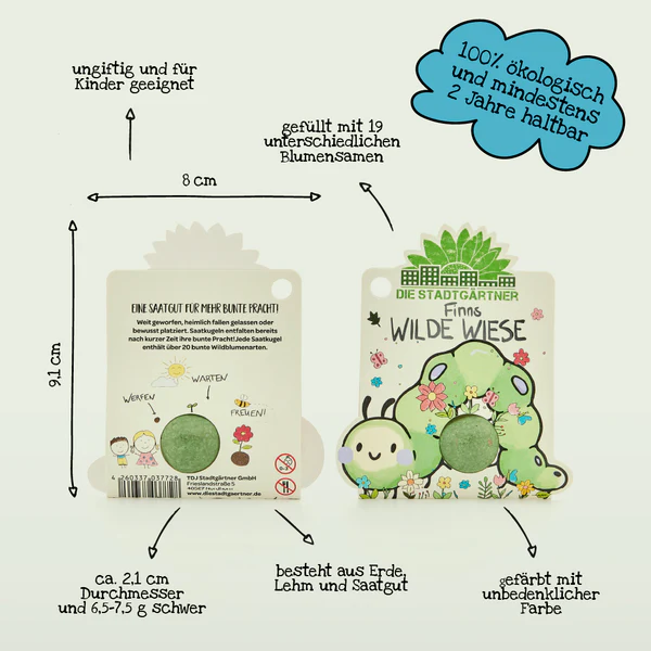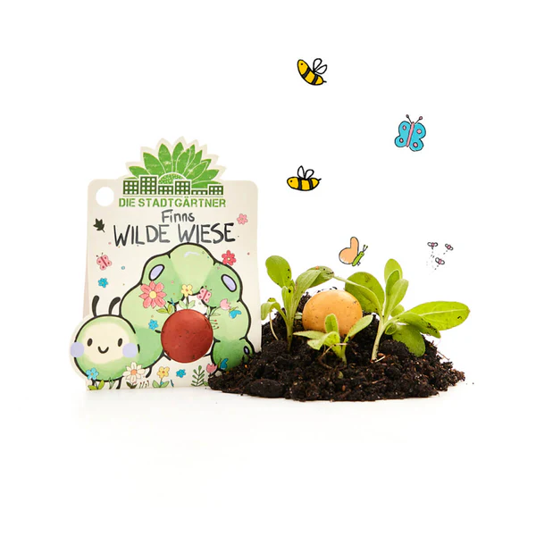Die kunterbunte Die Stadtgärtner 1er Blumenmurmel | Finnis Wilde Wiese ist eine originelle und nachhaltige Geschenkidee für Kinder. Gefüllt mit ungiftigem Wildblumen-Saatgut und natürlich gefärbt, lässt sie sich einfach auswerfen und verwandelt Garten, Balkon oder Beet in eine bunte, insektenfreundliche Blühfläche.