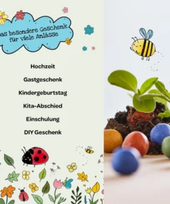 Die Blumenmurmel einfach auf lockere Erde werfen oder legen, regelmässig giessen und an einem sonnigen bis halbschattigen Ort platzieren. Mit etwas Geduld entsteht eine bunte Wildblumenfläche, die Kinder begeistert und Insekten anzieht.