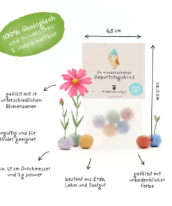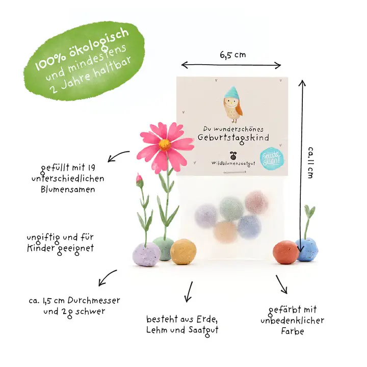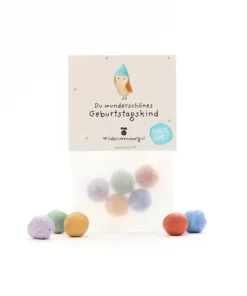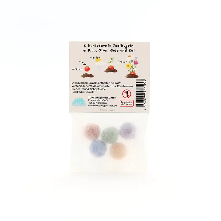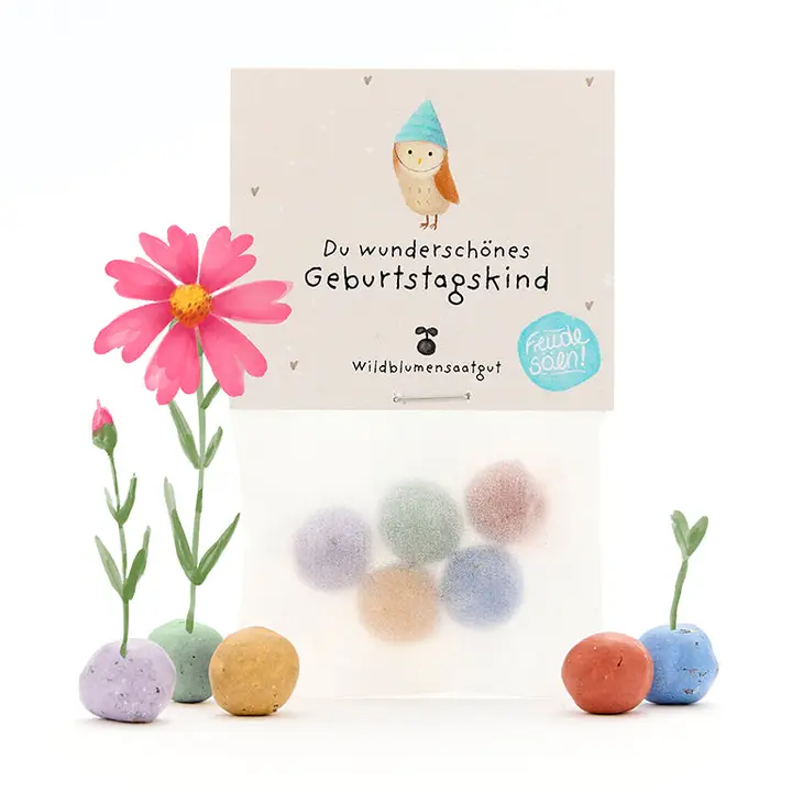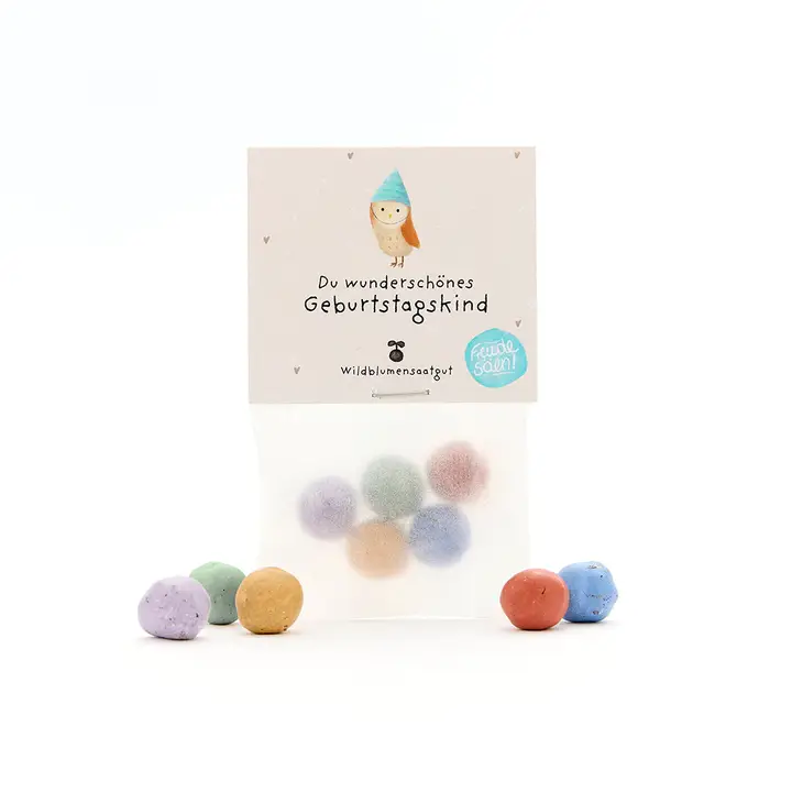 Die liebevoll gestalteten Die Stadtgärtner 5er Blumenmurmeln im Beutel | Geburtstagskind ist eine nachhaltige Geschenkidee für viele Anlässe. Einfach auswerfen, giessen und mit etwas Geduld beim Wachsen zusehen – schon entsteht eine bunte Blumenpracht, die Freude schenkt und Insekten anzieht.