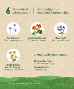 - Enthält Sorten wie Kapuzinerkresse, Kornblume und Ringelblume