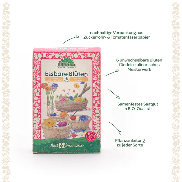 Das Die Stadtgärtner BIO Saatgut-Set (6 Sorten) | Essbare Blüten bringt kreative Vielfalt in Küche und Garten. Mit 6 samenfesten Sorten wie Kapuzinerkresse, Kornblume und Ringelblume verleihst du Salaten, Desserts und Getränken eine besondere Optik und feine, essbare Akzente.