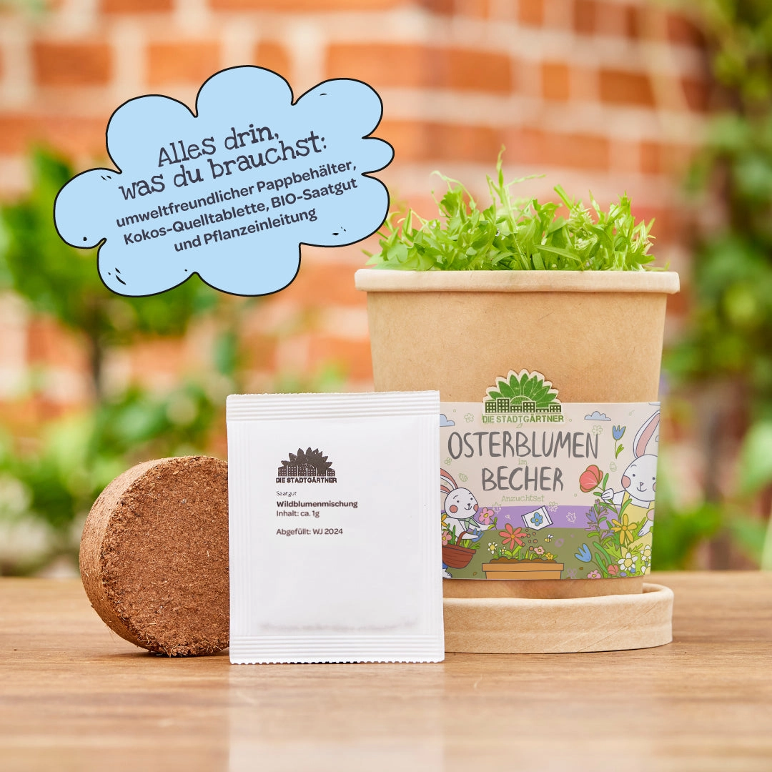 Das liebevoll gestaltete Anzuchtset Die Stadtgärtner Osterblümchen aus dem Becher ist ein blühendes Ostergeschenk für Gross und Klein. Mit Kokos-Quelltablette, hochwertigem Saatgut und umweltfreundlichem Becher gelingt die Anzucht kinderleicht und bringt frühlingshafte Farbe auf Fensterbank, Balkon oder in den Garten.