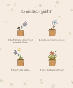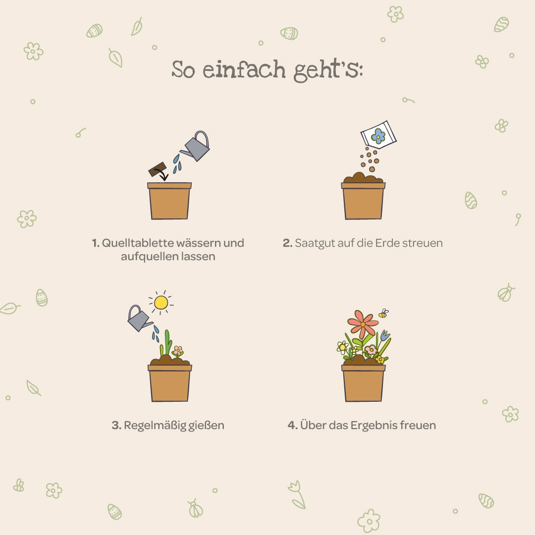 Die Kokos-Quelltablette mit Wasser aufquellen lassen, das Saatgut aussäen und regelmässig giessen. Schon bald wachsen farbenfrohe Frühlingsblumen, die dein Zuhause, den Balkon oder den Garten verschönern und für frühlingshafte Osterfreude sorgen.