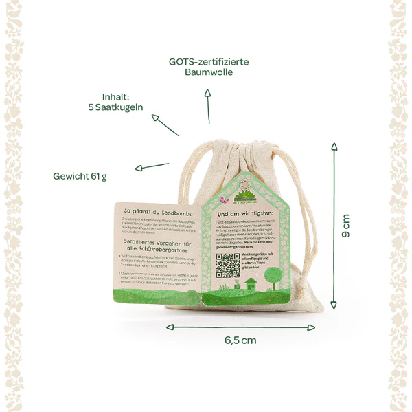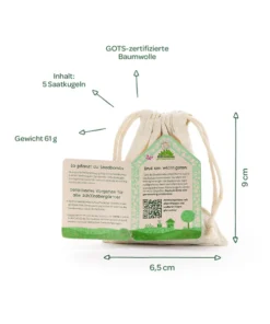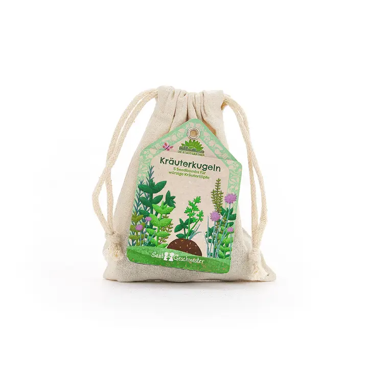 Die Saatkugeln sind eine einfache und nachhaltige Möglichkeit, frische Kräuter selbst anzubauen. Das wiederverwendbare Säckchen besteht aus GOTS-zertifizierter Baumwolle und macht das Set zu einer umweltbewussten Geschenkidee.