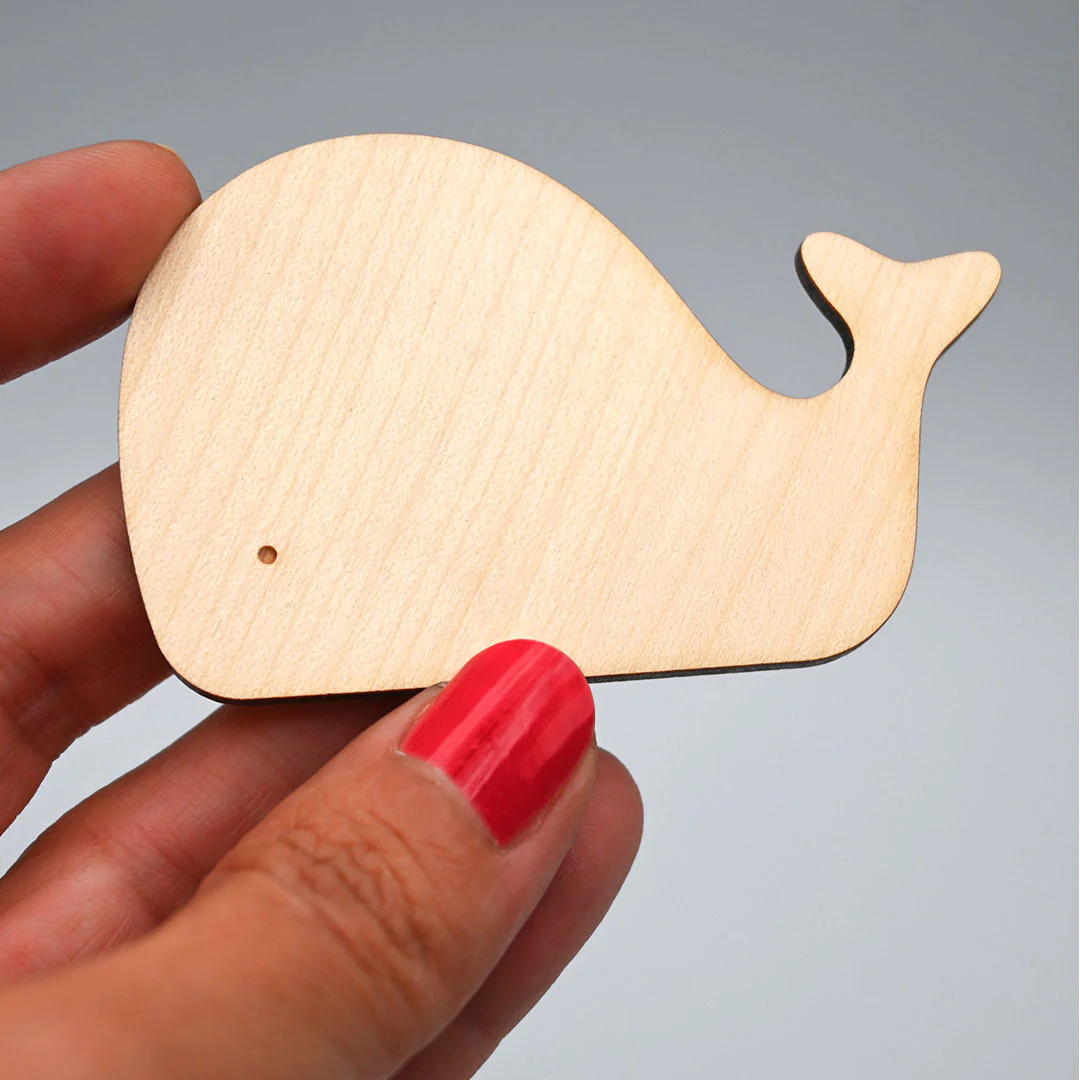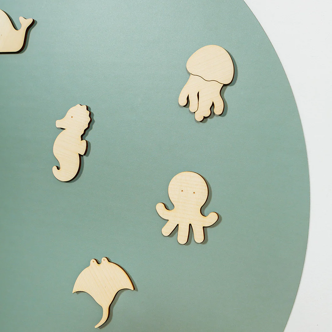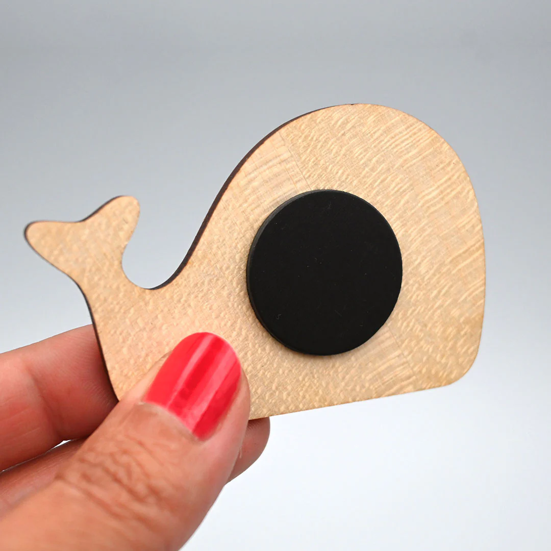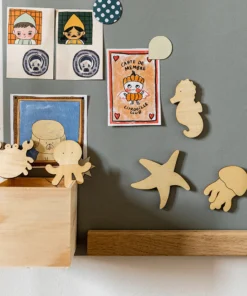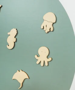 - 11 Magnettiere aus Ahornholz: Schildkröte, Rochen, Krabbe, Hai, Fisch, Delfin, Seestern, Seepferdchen, Oktopus, Wal, Qualle