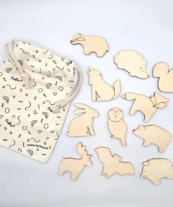 - 11 Magnettiere aus Ahornholz: Wolf, Bär, Hase, Wildschwein, Fuchs, Eichhörnchen, Fledermaus, Igel, Dachs, Eule, Reh