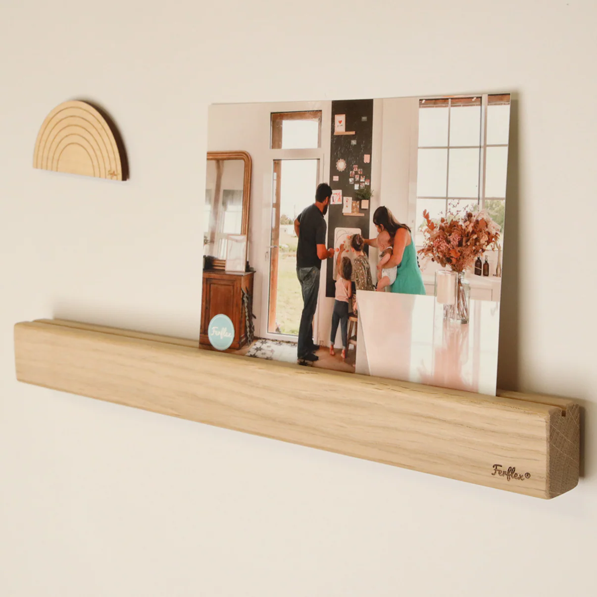 Dieses FERFLEX Magnetisches Wandregal aus Holz (Eiche) | 30 cm bringt Deine Lieblingsbilder dorthin, wo Du sie jeden Tag siehst. Einfach ohne Bohren auf Magnettafel, magnetische Tapete oder Kühlschrank befestigen. Mit praktischer Nut für Fotos, Karten & Poster – jederzeit neu arrangierbar.