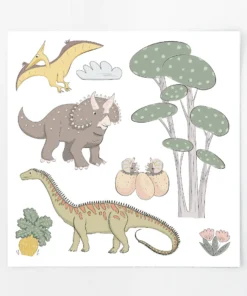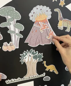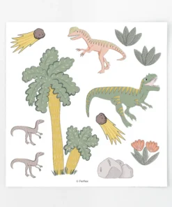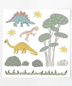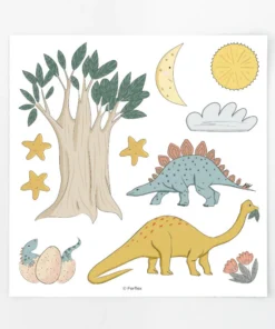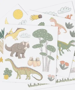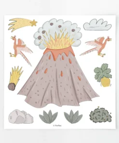 - Zusätzliche Elemente: Dino-Eier, Landschaft (Bäume, Felsen, Vulkan, Blattwerk) sowie Sterne, Sternschnuppen, Meteoriten