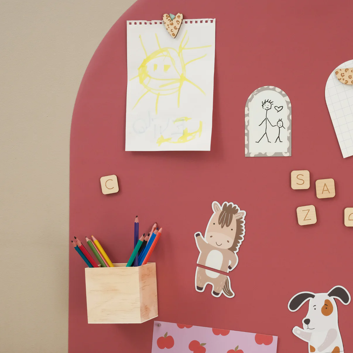 Diese FERFLEX Magnettafel BOGEN (selbstklebend) | terrakotta bringt frischen Wind ins Kinderzimmer! Ob zum Spielen, Gestalten oder Präsentieren – mit Ferflex® wird die Wand zur kreativen Fläche. Die Kombination aus flexibler Magnettafel und farbiger, abnehmbarer Beschichtung macht das Ganze besonders vielseitig. Einfach aufkleben, dekorieren und bei Bedarf neu gestalten – ganz ohne Kleberückstände.