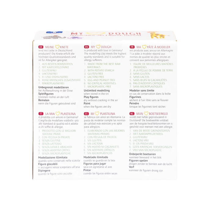 Sie enthält u. a. Kartoffelstärke, Wasser, Speisesalz, Zitronensäure, pflanzliche Öle, Lebensmittelfarben sowie biologisch abbaubaren Bio-Glitter. Die Knete ist glutenfrei, lactosefrei, eiweissfrei und frei von Erdnüssen – daher bestens für Allergiker geeignet