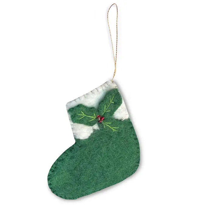 Der handgefertigte Gamcha Deko Aufhänger aus Filz | Socke grün mit feinen Motiv ist eine tolle Dekorationsmöglichkeit. Dekoriere den Tannenbaum, einen Zweig oder sonst etwas. Auch eine schöne Möglichkeit mit Kindern zu dekorieren. Das Schöne an diesem handgefertigten Filz Deko Aufhhänger ist, dass er von nepalesischen Kunsthandwerkerinnen mit Sorgfalt und Kreativität hergestellt wird.