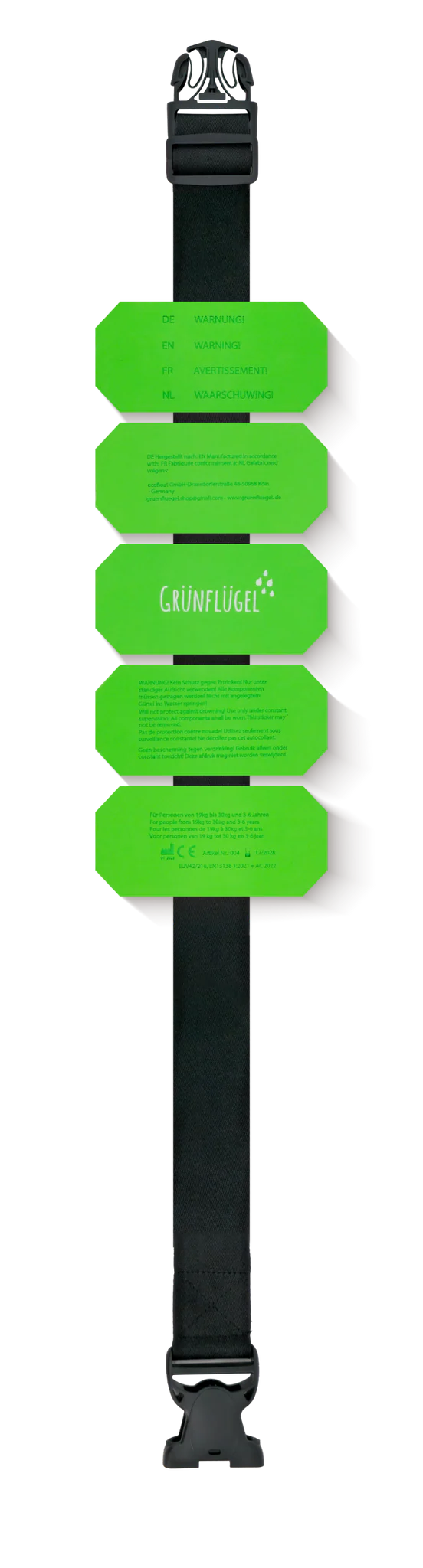 Umweltfreundlich, sicher und effektiv: Der Grünflügel Schwimm Gürtel (ab 3 Jahren / 19-30 kg) unterstützt dein Kind beim Schwimmenlernen und fördert Koordination, Technik und Wassergefühl – hergestellt aus BIO‑TPE und GRS‑zertifiziertem Nylon, geprüft nach EN 13138‑2.