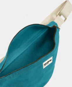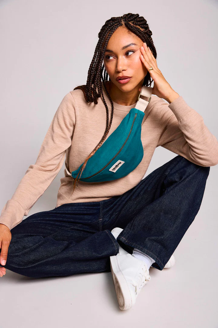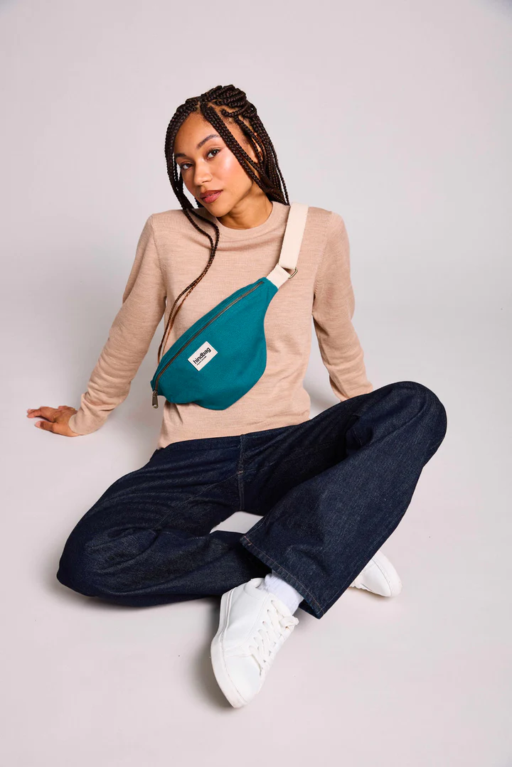 Die Hindbag Bauchtasche OLIVIA | pfauenblau die schnell unverzichtbar wird! Mit ihrer sehr dicken und festen Bio-Baumwolle trägt sie Ihre täglichen Essentials, ohne sich zu verformen. Dank der verstellbaren Schnalle, kannst du sie im Winter über einem dicken Mantel genauso gut tragen wie im Sommer über einem leichten T-Shirt.