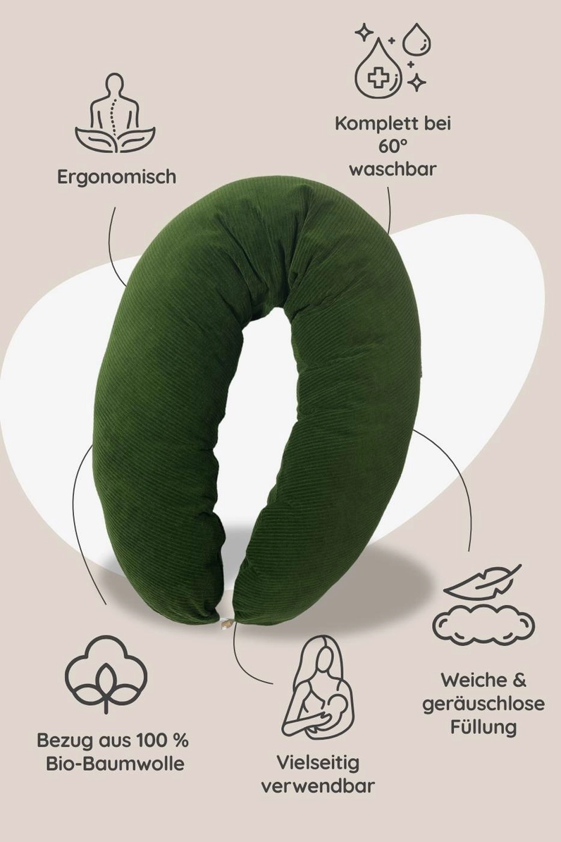 In den ersten Wochen nach der Geburt ist Nähe, Ruhe und Geborgenheit das Wichtigste – und genau dabei unterstützt Dich das Hobea Stillkissen Cord | moos. Mit seiner weichen, geräuschlosen Füllung und dem atmungsaktiven Bio-Baumwollbezug sorgt es für entspannte Stillmomente und sicheren Halt – sowohl für Dich als auch für Dein Baby.