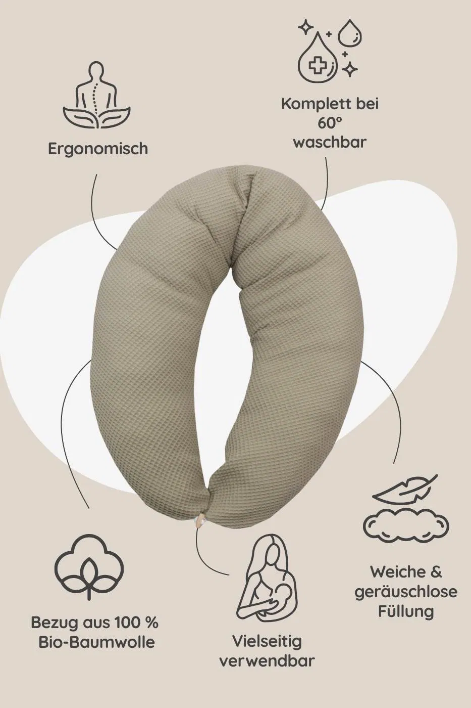 - Als Stillkissen: komfortable, ergonomische Unterstützung beim Stillen oder Fläschchengeben