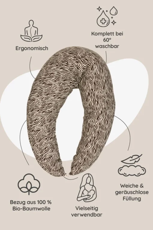 In den ersten Wochen nach der Geburt ist Nähe, Ruhe und Geborgenheit das Wichtigste – und genau dabei unterstützt Dich das HHobea Stillkissen | Zebra. Mit seiner weichen, geräuschlosen Füllung und dem atmungsaktiven Bio-Baumwollbezug sorgt es für entspannte Stillmomente und sicheren Halt – sowohl für Dich als auch für Dein Baby.