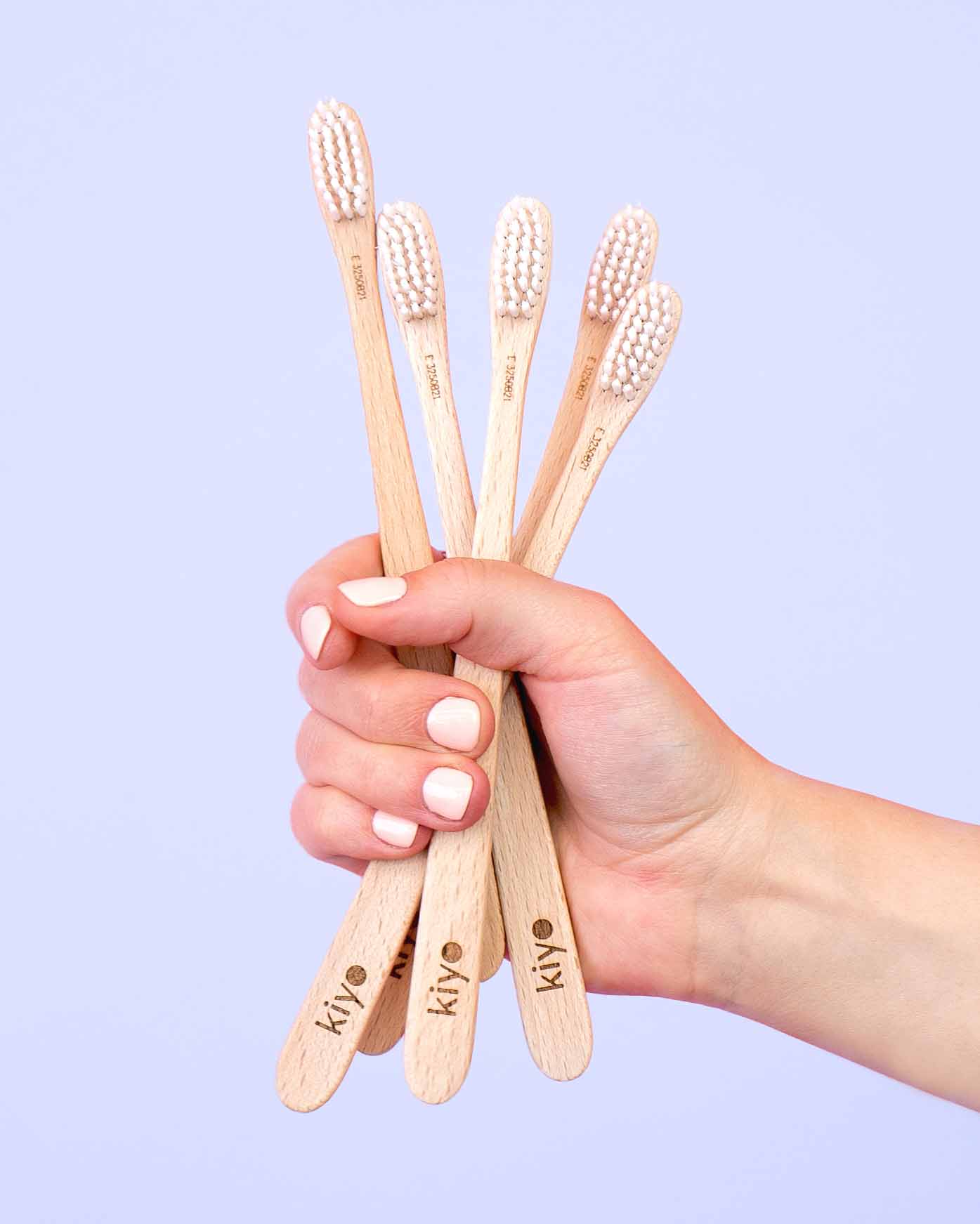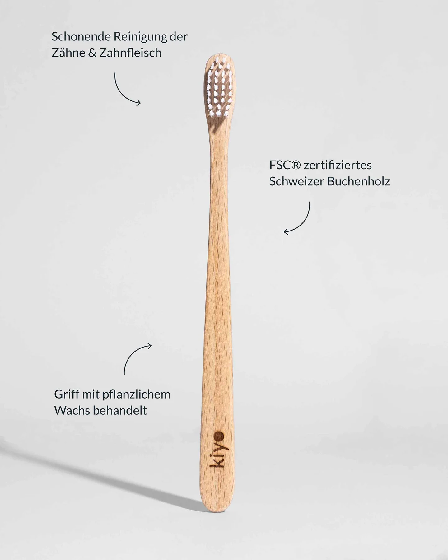 Natürlich putzen statt Plastik im Mund: Die kiyo ERW Zahnbürste aus Schweizer Buchenholz | Soft aus FSC®-zertifiziertem Schweizer Buchenholz liegt angenehm in der Hand und reinigt mit weichen Soft-Borsten sanft und gründlich. Vegan gewachster Griff, plastikfrei verpackt – ideal auch für empfindliches Zahnfleisch.