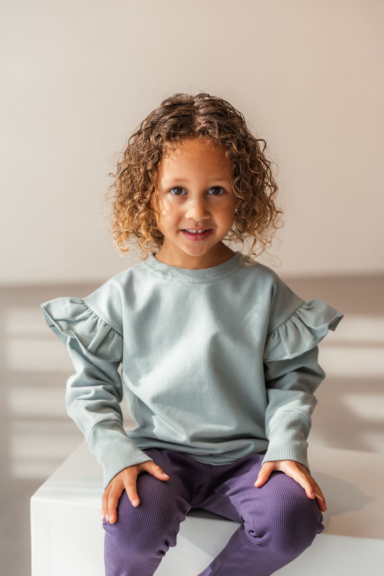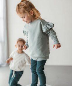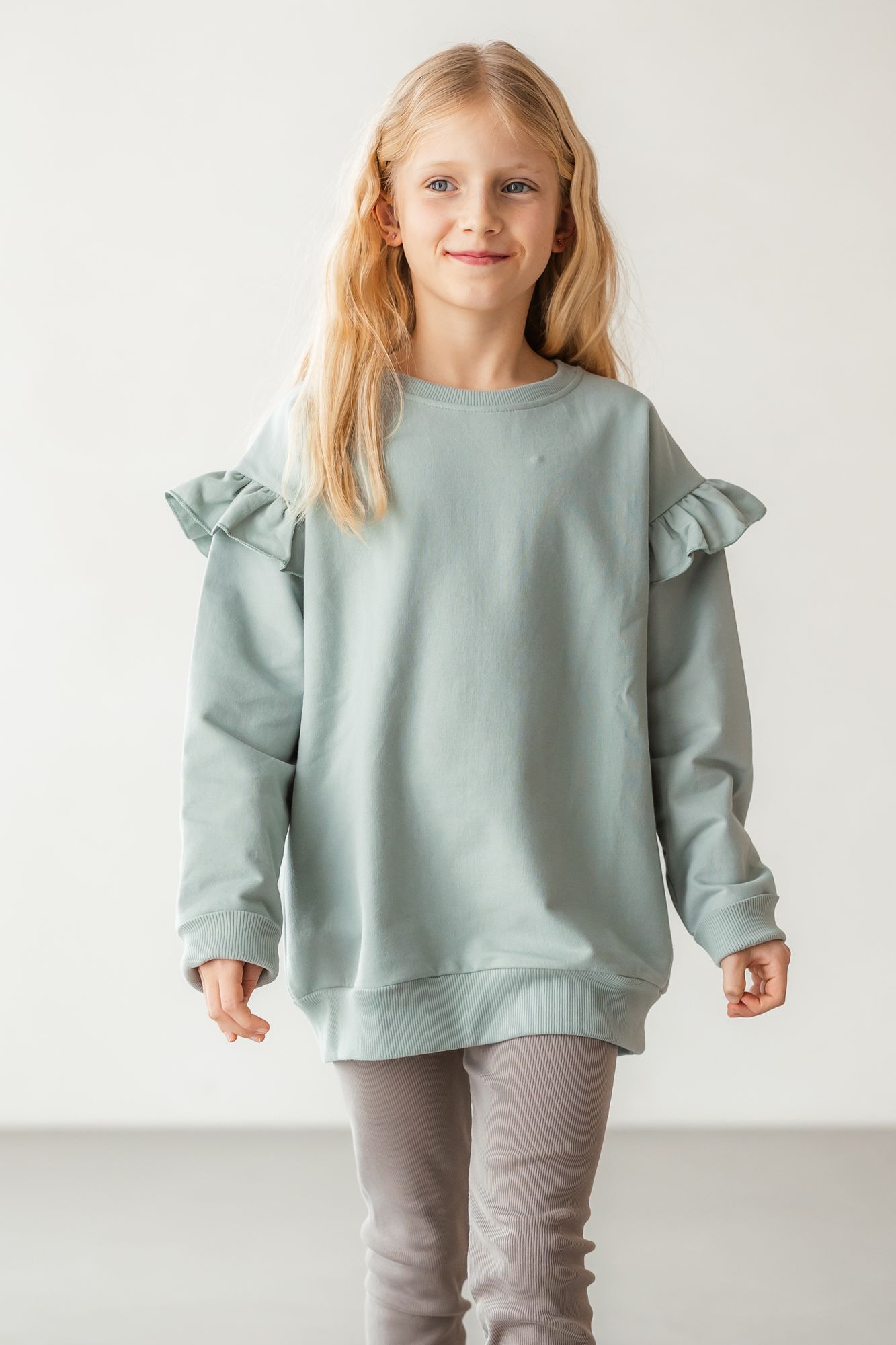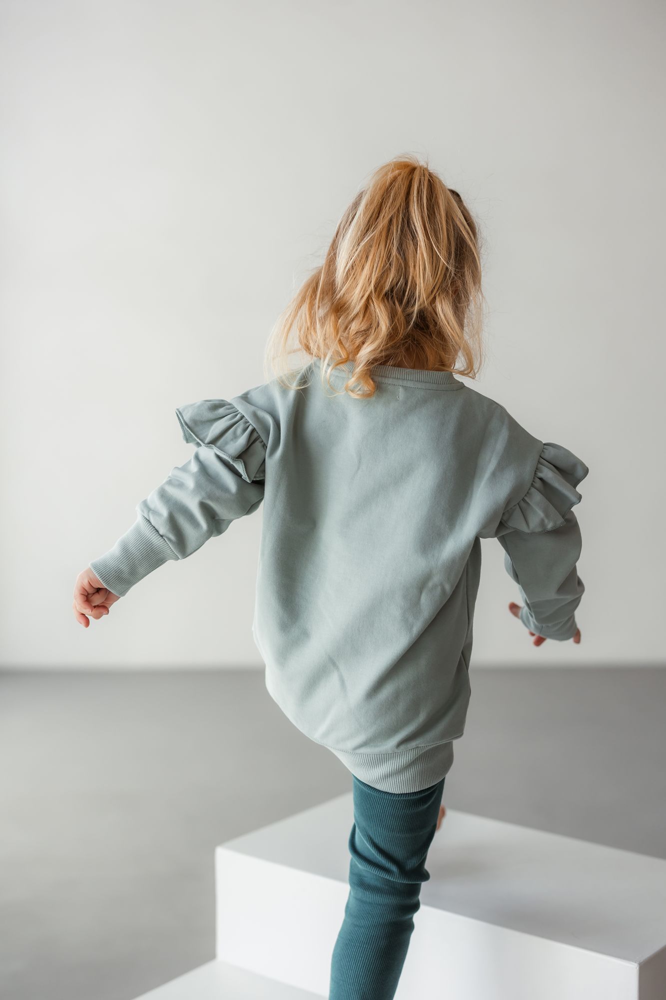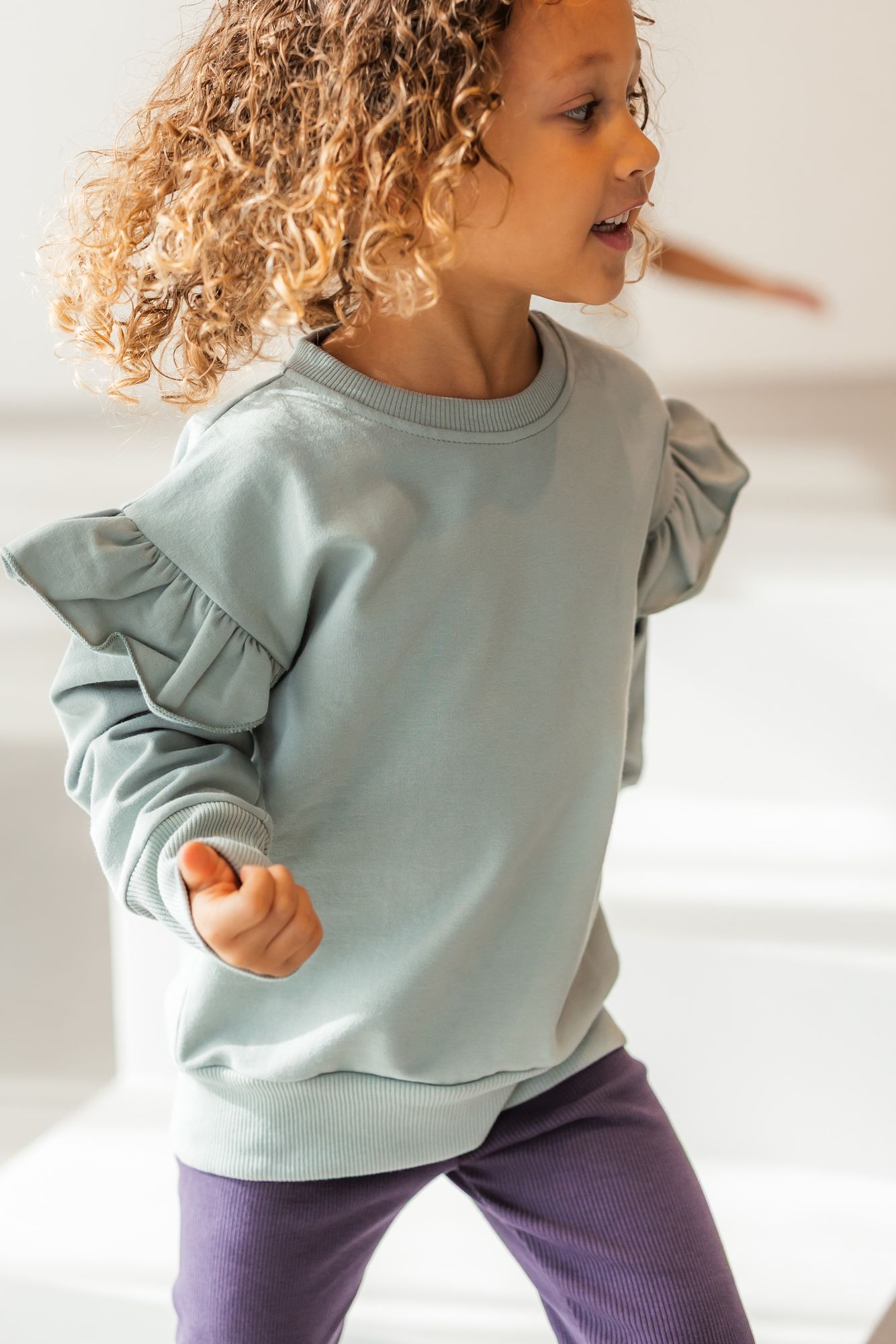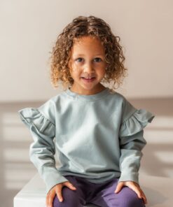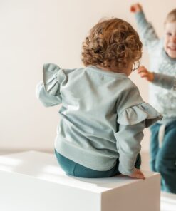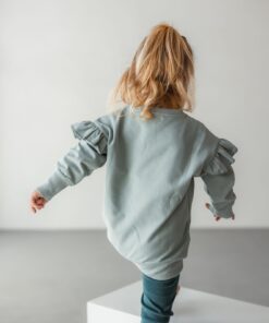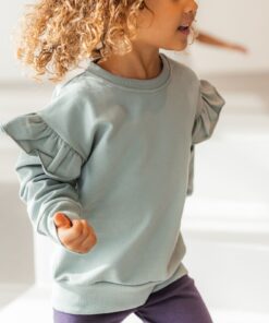 Das KUKKA Living Kinder Sweatshirt AVA | soft mint vereint Komfort und verspieltes Design. Zarte Rüschen an den Schultern machen es zu einem echten Hingucker, während die weiche Bio-Baumwolle für ein angenehmes Tragegefühl sorgt. Perfekt für den Alltag und gemütliche Stunden. In Portugal gefertigt, steht es für Qualität und Stil im Alltag.