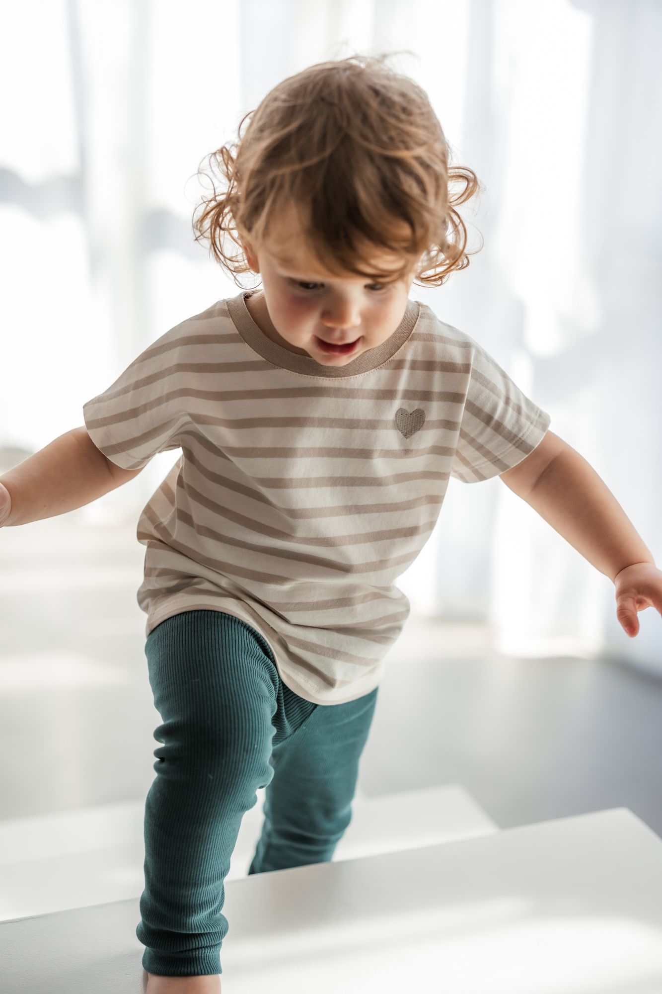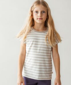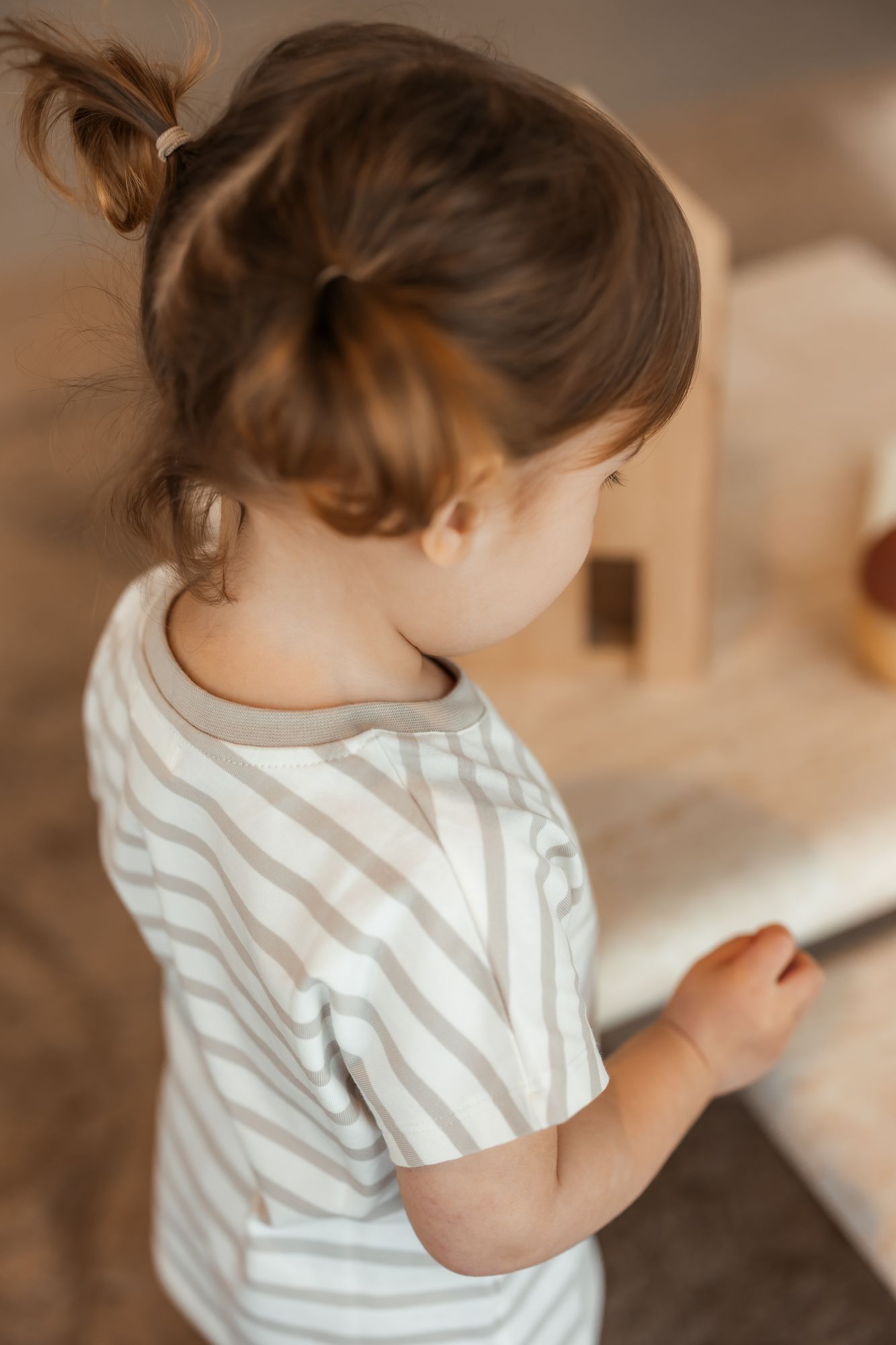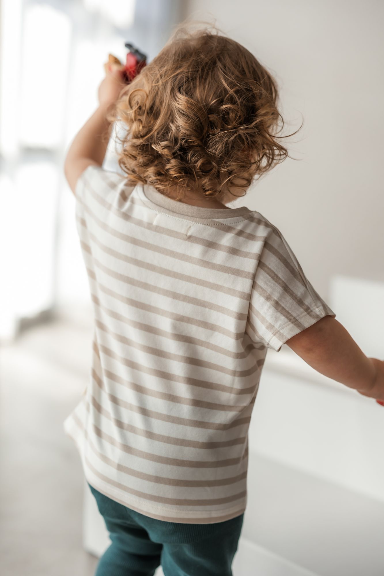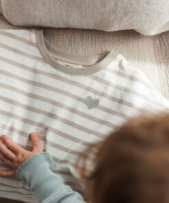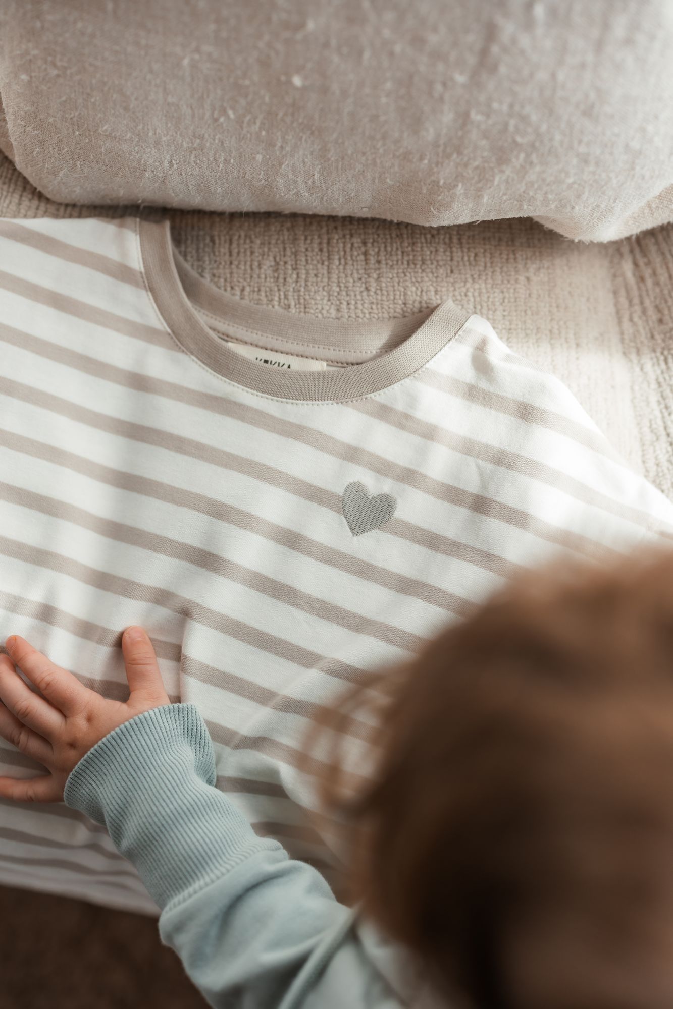 Das KUKKA Living Kinder T-Shirt JUNA | striped sand vereint weichen Bio-Jersey mit einem liebevollen Design. Der angenehme Stoff sorgt für hohen Tragekomfort, während das feine Streifenmuster und das kleine Herz-Detail dem Shirt eine besondere Note verleihen – ideal für jeden Tag.