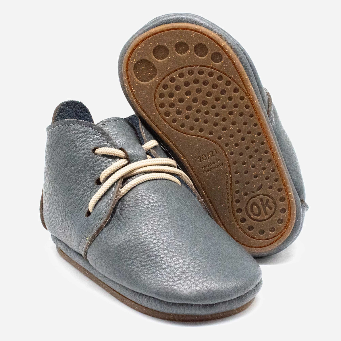 Der Orangenkinder Barfussschuhe AMIGO Schnürer (ohne Futter) | blaugrau ist ideal für kleine Lauflerner. Leicht, atmungsaktiv und individuell anpassbar, bietet er sicheren Halt bei den ersten Schritten. Die flexible, rutschfeste Sohle und das weiche Bio-Nappaleder sorgen für ein natürliches und bequemes Laufgefühl.