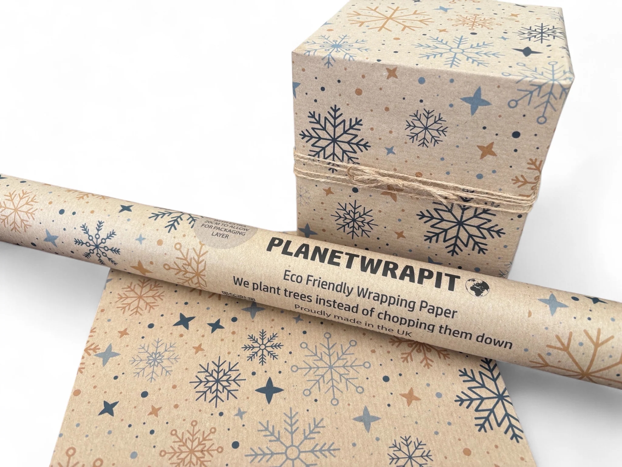 Das Planetwrapit Nachhaltiges Geschenkpapier Rolle 5mx50cm | Christmas Snowflake vereint Umweltfreundlichkeit und festliches Design in einem Geschenkpapier, das perfekt für eine nachhaltige Weihnachtszeit, Geburtstag oder andere Schenkmomente geeignet ist. Mit den vielseitigen charmanten Muster auf recyceltem Kraftpapier bringt es Stimmung und unterstützt gleichzeitig die Umwelt. Jedes Blatt wird in Nottinghamshire, UK, handgefertigt und steht für Qualität und Liebe zum Detail – ohne Plastik, Glitzer oder nicht-recycelbare Elemente.