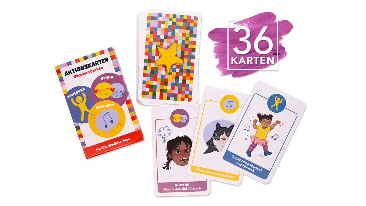 - 36 Karten: je 12x Bewegung, Gefühle & Geräusche