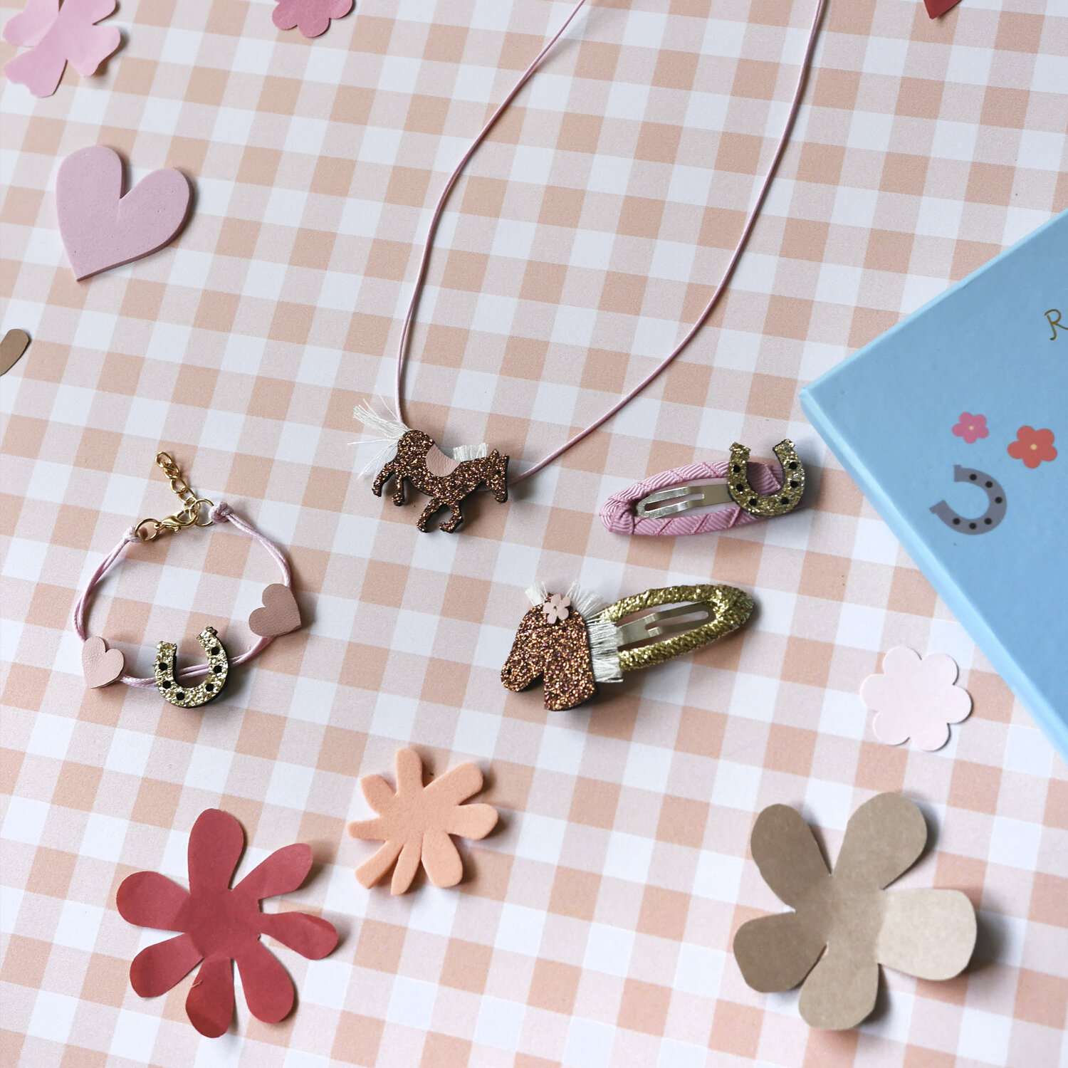 Perfekt für den Alltag oder besondere Anlässe: Ob im Haar, am Handgelenk oder als funkelndes Detail am Hals – das Set bringt Kinderaugen zum Leuchten und verleiht jedem Outfit einen Hauch von Ponyhof-Magie.