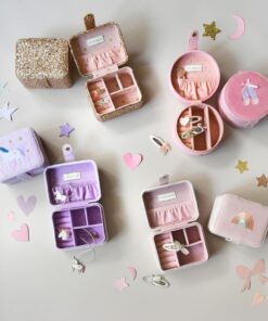 Diese zauberhafte Rockahula Jewellery Box | Confetti Glitter Gold ist der perfekte Ort, um all den Rockahula-Schmuck und deine Lieblingsschätze sicher aufzubewahren! Diese Schmuckschatulle mit einem aufgestickten Einhorn und schimmernden Sternen öffnet sich leicht und hat drei Fächer, eine Einschubtasche und einen speziellen Platz für Ohrringe und Ringe. Gefüttert mit Sternenstoff.