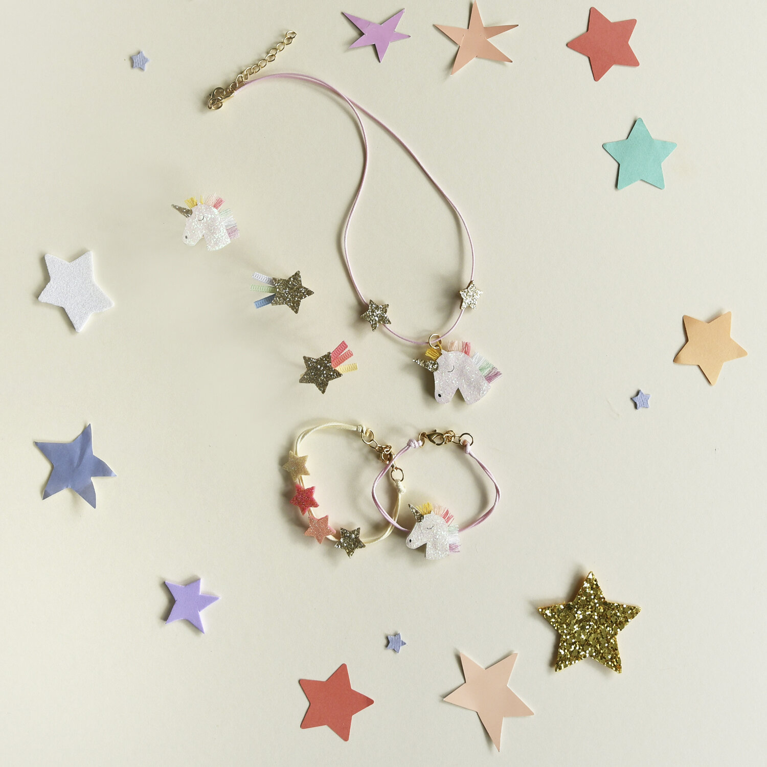 Perfekt für Einhornliebhaber: Die süsse Einhorn Kette mit Sternen zieren diese blassrosa Kordelkette. Mit Karabinerverschluss und Verlängerungskette für die perfekte Passform.