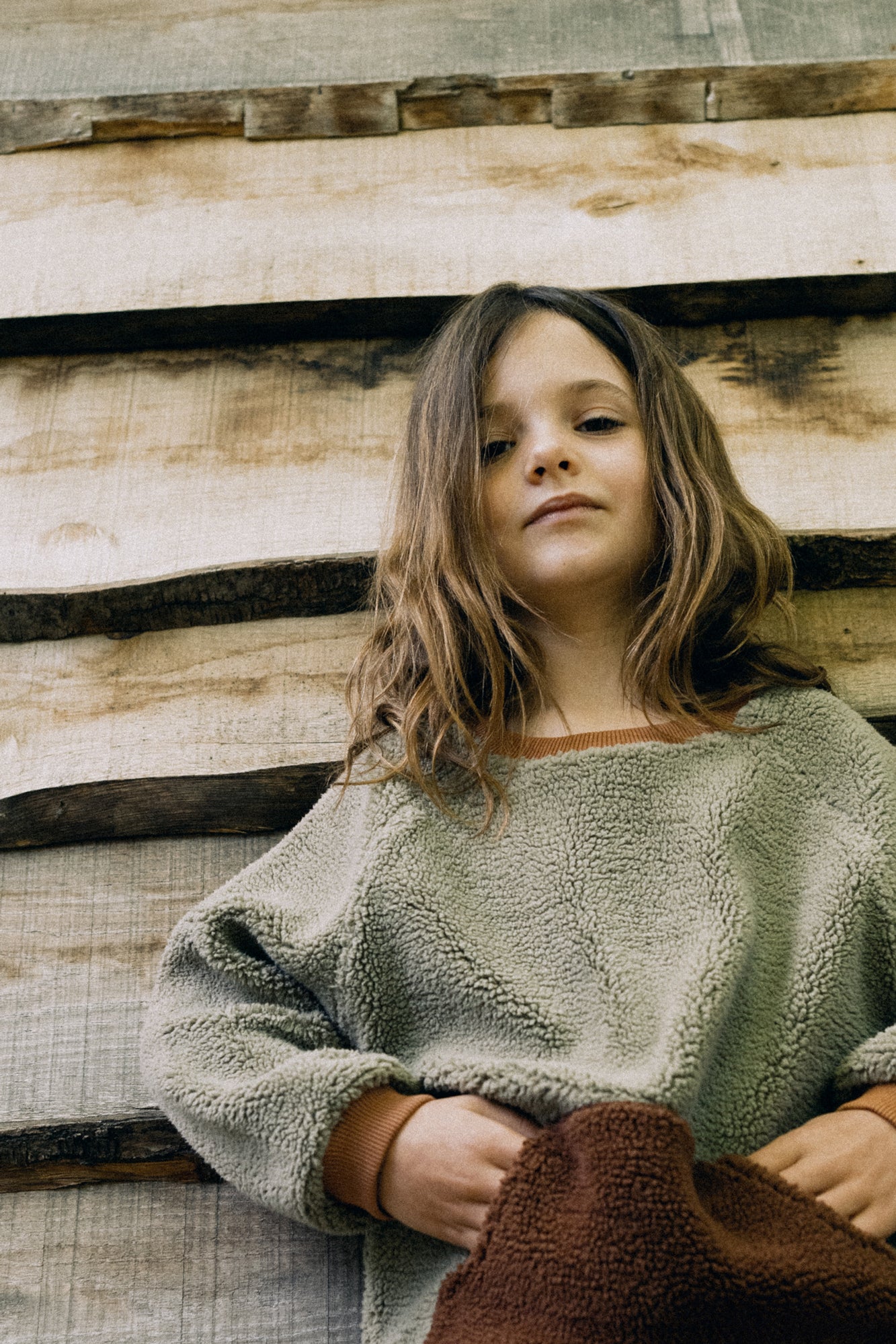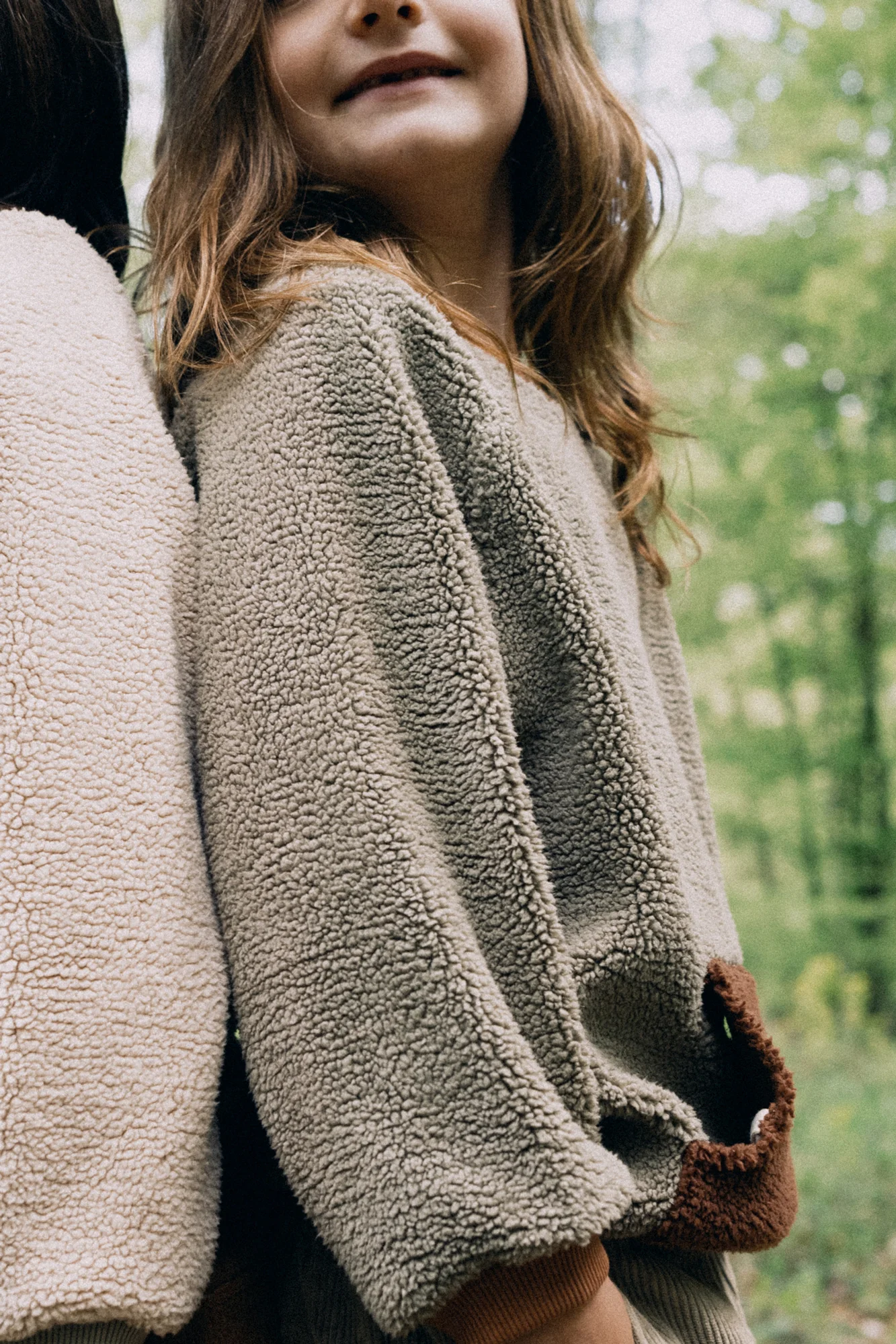 Dieses kuschelige Tiralahilacha Kinder unisex Sherpa Sweatshirt (Bio-Baumwolle) TANIT | Green aus 100 % GOTS-zertifizierter Bio-Baumwolle ist wie gemacht für kalte Wintertage. Weich, warm und leicht – mit lockerer Passform, überschnittenen Schultern und elastischen Bündchen für maximalen Komfort und Bewegungsfreiheit.