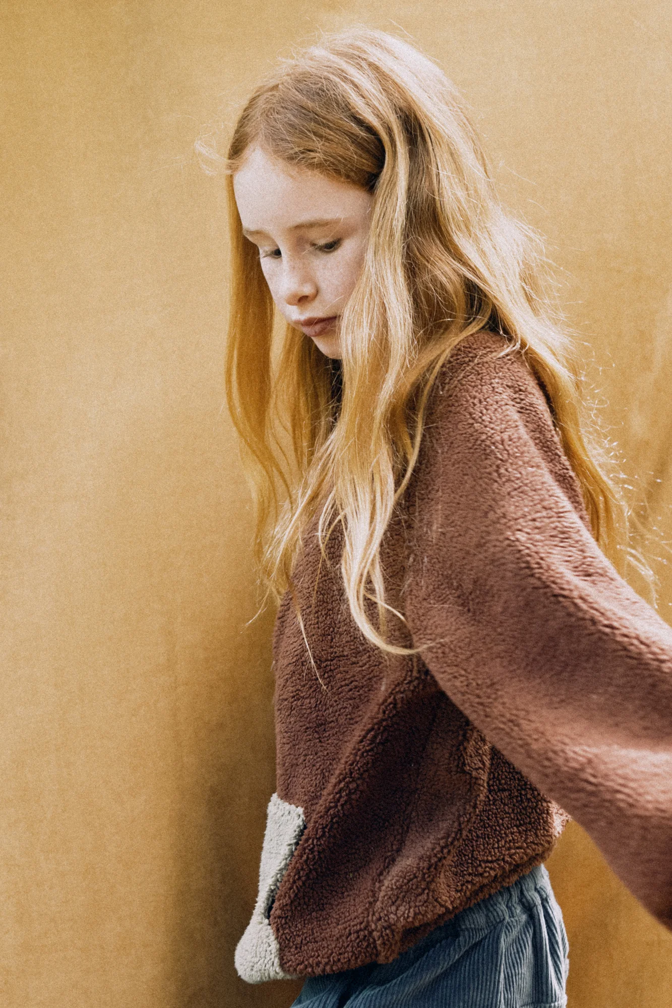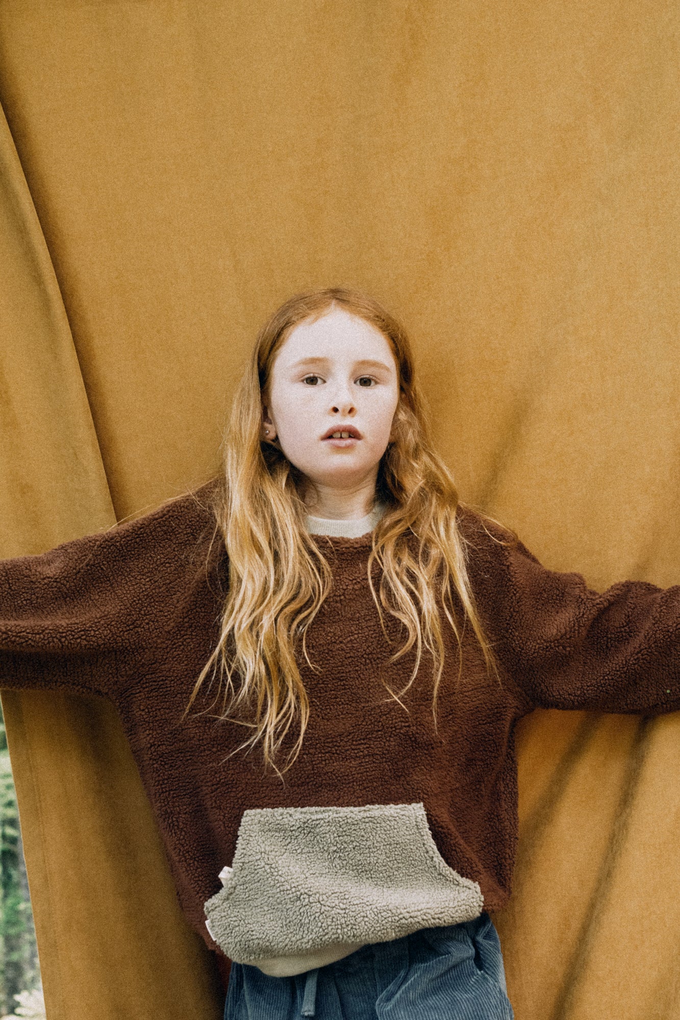 Dieses kuschelige Tiralahilacha Kinder unisex Sherpa Sweatshirt (Bio-Baumwolle) TANIT | Braun aus 100 % GOTS-zertifizierter Bio-Baumwolle ist wie gemacht für kalte Wintertage. Weich, warm und leicht – mit lockerer Passform, überschnittenen Schultern und elastischen Bündchen für maximalen Komfort und Bewegungsfreiheit.