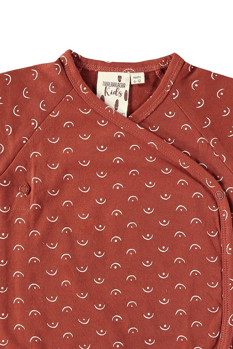 Der kurzärmelige Wickel-Body Tiralahilacha Wickel-Body kurzarm | Tits Red aus 100 % Bio-Baumwolle ist besonders sanft zur empfindlichen Babyhaut. Dank der praktischen Wickelöffnung mit seitlichen Druckknöpfen lässt er sich mühelos an- und ausziehen – perfekt für Neugeborene und kleine Entdecker. Das weiche, atmungsaktive Material sorgt für ein angenehmes Tragegefühl, während das verspielte Muster in warmem Rot für einen fröhlichen Look sorgt.