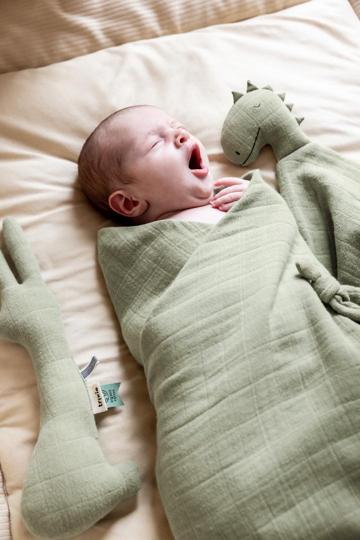 Zum Einschlafen, Kuscheln und Entdecken: Das Trixie Baby Schmusetuch Bliss (Bio-Musselin) | Dino begleitet dein Baby überallhin. Mit freundlich lächelndem Gesicht und aus extra weichem Bio-Musselin gefertigt, wird es schnell zum Lieblingsbegleiter für unterwegs und zuhause – schon ab Geburt.
