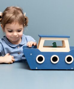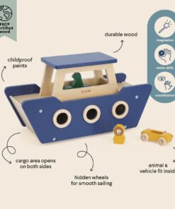 Alle an Bord! Mit dieser liebevoll gestalteten Trixie Holz Fähre (ab 18m +) befördern kleine Kapitäninnen und Kapitäne Tiere und Autos sicher ans andere Ufer. Bewegliche Rampen und versteckte Rollen sorgen für realistischen Spielspass – ganz ohne Wasser, aber mit viel Fantasie!
