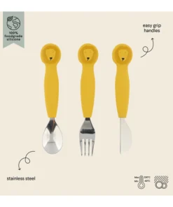 Das Trixie Kinderbesteck mit Silikongriff 3teilig (12m+) | Löwe ist ein weiches, kinderfreundliches Besteck aus griffigem Silikon und robustem Edelstahl – ideal für selbstständiges Essen ab ca. 12 Monaten. Mit lustigem Tier-Motiv begleitet es Dein Kind bei jedem Bissen und macht das Essenlernen zum Spass!