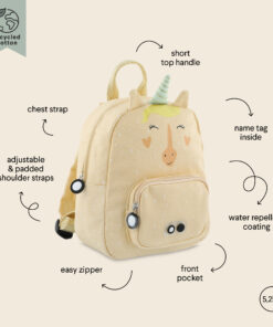 Dieser fröhliche Trixie Kleinkind Rucksack | Einhorn ist der ideale Begleiter für Kinder ab 2 Jahren. Perfekt für die Kita oder kleine Ausflüge mit dem Lieblingsspielzeug und einem tierischen Freund! Er bietet ein Hauptfach und eine kleine Fronttasche, beide mit großen, kinderfreundlichen Reißverschlüssen. Die gepolsterten, verstellbaren Schultergurte mit Brustgurt verhindern ein Abrutschen. Ein Namensschild im Inneren sorgt für Verwechslungsschutz. Der Rucksack ist wasserabweisend und besteht zu 60% aus recycelter Baumwolle.