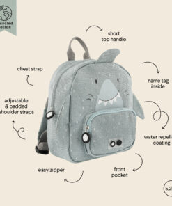 Dieser fröhliche Trixie Kleinkind Rucksack | Hai ist der ideale Begleiter für Kinder ab 2 Jahren. Perfekt für die Kita oder kleine Ausflüge mit dem Lieblingsspielzeug und einem tierischen Freund! Er bietet ein Hauptfach und eine kleine Fronttasche, beide mit großen, kinderfreundlichen Reißverschlüssen. Die gepolsterten, verstellbaren Schultergurte mit Brustgurt verhindern ein Abrutschen. Ein Namensschild im Inneren sorgt für Verwechslungsschutz. Der Rucksack ist wasserabweisend und besteht zu 60% aus recycelter Baumwolle.