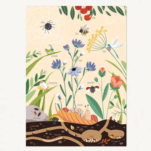 Tauche ein in die faszinierende Welt unter der Erde und auf der Wiese! Dieses liebevoll illustrierte Poster zeigt eine Auswahl wunderschöner Insekten unter und über der Erde – perfekt fürs Kinderzimmer, für kleine Entdecker:innen.