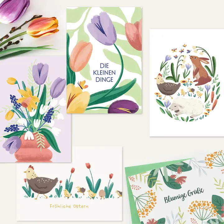VIERUNDFÜNFZIG Postkarte | Frühlingstiere – Hase, Lamm, Henne mit Küken